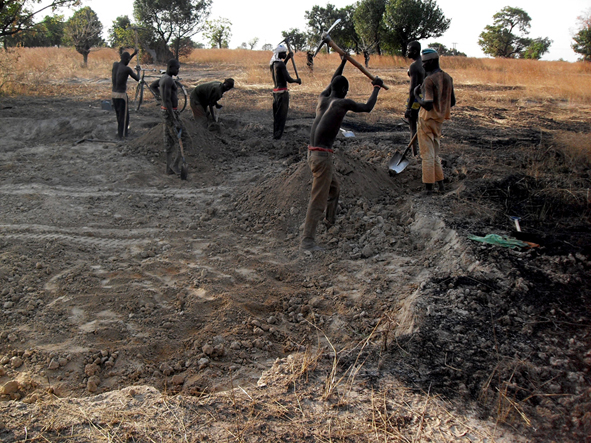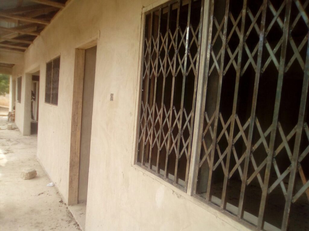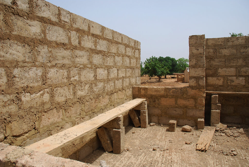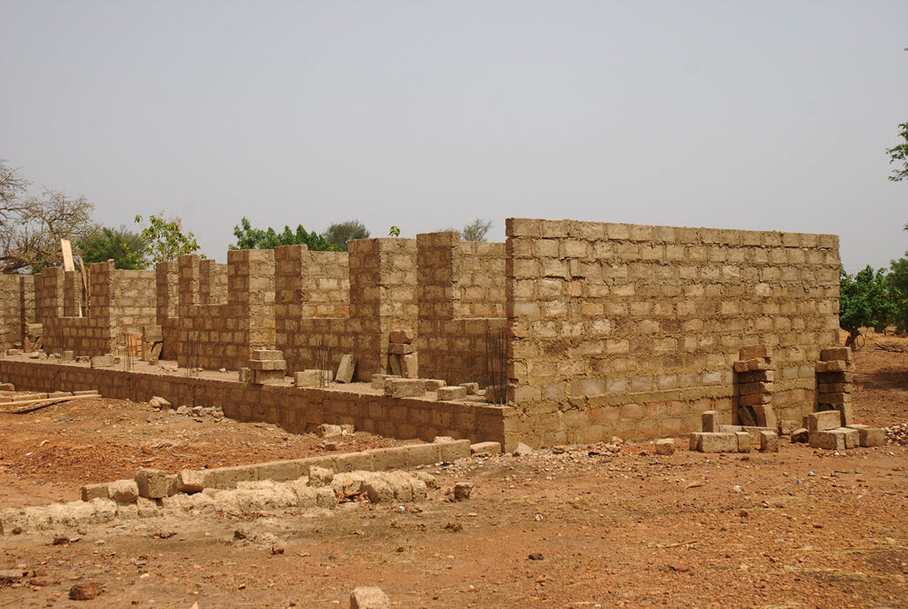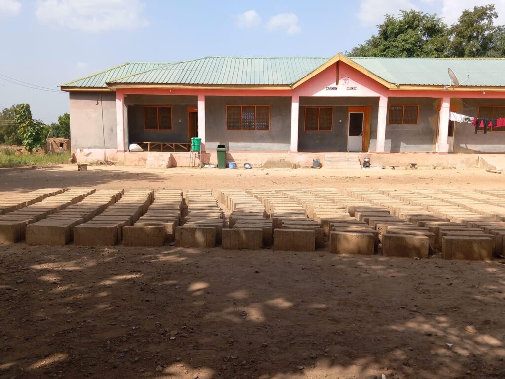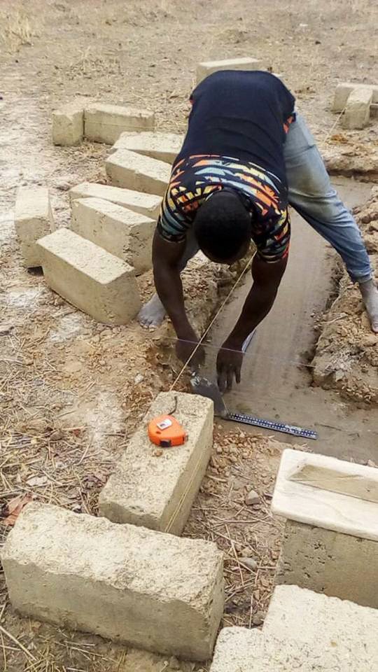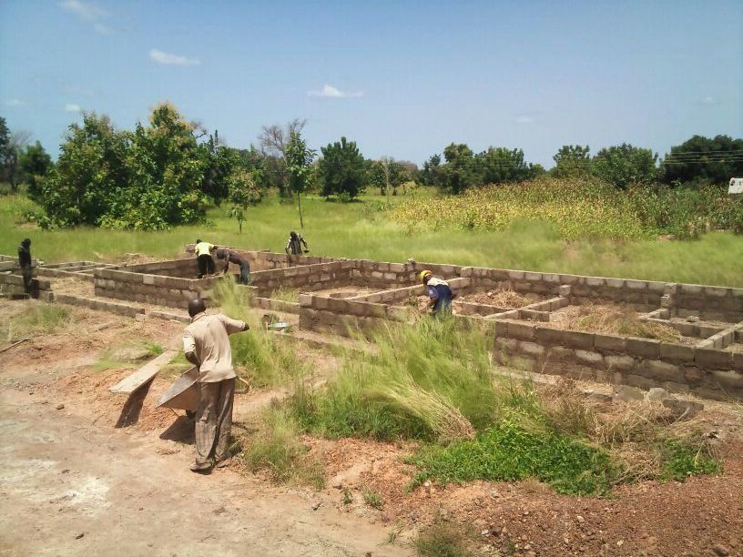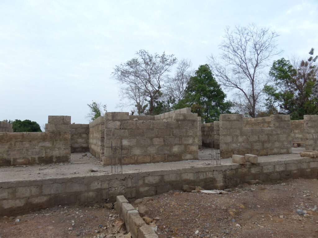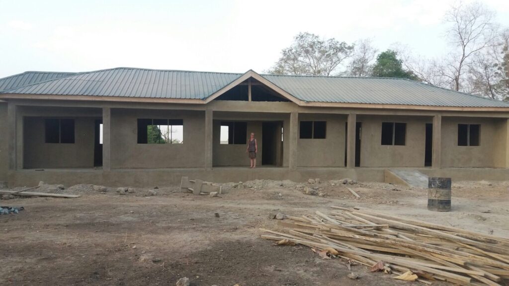 Gezien de ligging van de clinic is veel werk geïnvesteerd in de fundering. Ghana is niet plat en de clinic ligt dus in een klein dalletje. Wat betekent dat in het regenseizoen er een kans bestaat op teveel water. Door het geheel op te hogen voorkomen we deze problemen. Maar belangrijk dat de basis goed is!