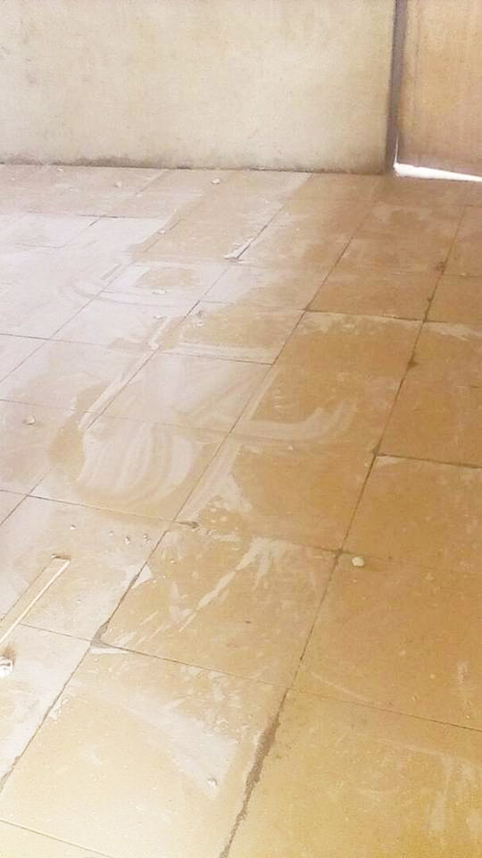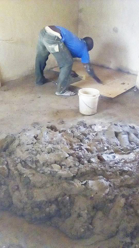 Dan de vloeren storten, zodat er een tegelvoer gelegd kan worden. Gebruikelijk hier is een geverfde cementvloer, maar gezien de hygiëne gaan we daar niet voor. Het stuken wordt door een vakman gedaan. Het is te specialistisch om dit door de dorpelingen te laten doen. Het zijn harde werkers, van 6.00 uur tot 18.00 uur.