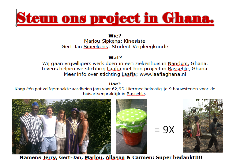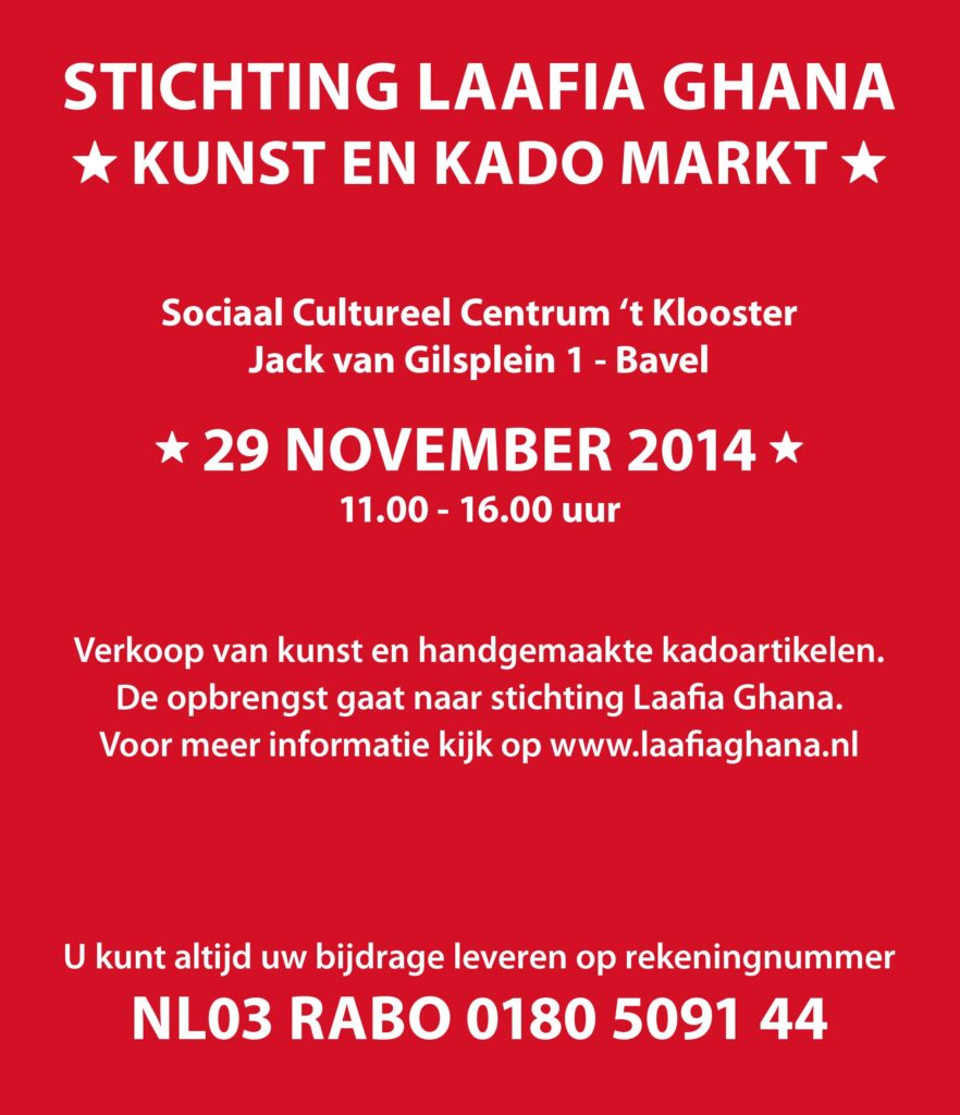 Acties Januari 2024 – Onze zorg kent geen grenzen! https://www.gofundme.com/f/neem-samen-met-ons-de-zorgen-uit-ghana-weg?_gl=1r3gcz_up*MQ..&gclid=EAIaIQobChMI4ZCZiuqFhAMV6adoCR1mfgEdEAAYASAAEgJCWvD_BwE Juli 2016 – Overhandiging cheque, Ubuntu December 2015 – Kerstveiling November 2014 – Kunst en kadomarkt Juli 2014 – Jampotten actie April 2014 – Overhandiging cheque, actie St. Willibrordusschool Alphen